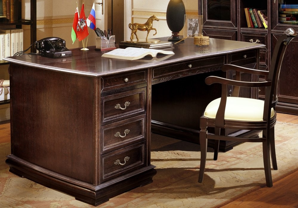 Фасад стола письменного из массива дуба, филёнки дверей и ящиков из МДФ облицованное шпоном. Крышка стола из ДСП, облицованной шпоном дуба, обкладка по периметру из массива дуба. |